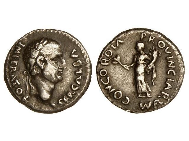 Roman Coins: Roman Empire - Denario. 68-69 d.C. GALBA. Anv.: SER. GALBA IMPERATOR. Cabeza laureada a derecha. Rev.: CONCORDIA PROVINCIARVM. Concordia en pie a izquierda. (Pequeño fallo de acuñación en rostro). MUY ESCASA. C-34. MBC+.