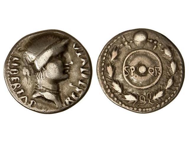 Roman Coins: Roman Empire - Denario. 68-69 d.C. PERÍODO GUERRA CIVIL. TARRACO. Anv.: LIBERTAS RESTITVTA. Cabeza de Libertad a derecha. Rev.: Escudo con inscripción SP-QR, dentro de láurea. (Rayitas en campo anverso). RARA. AB-R92; JB-27. (MBC+).