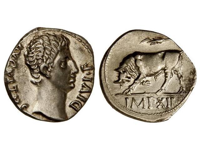 Roman Coins: Roman Empire - Denario. Acuñada el 11-10 a.C. AUGUSTO. Anv.: AVGVSTVS DIVI. F. Cabeza descubierta a derecha. Rev.: Toro embistiendo a izquierda. En exergo: IMP. XII. RARA. C-158; Cal-841; FFC-122. EBC+/EBC.