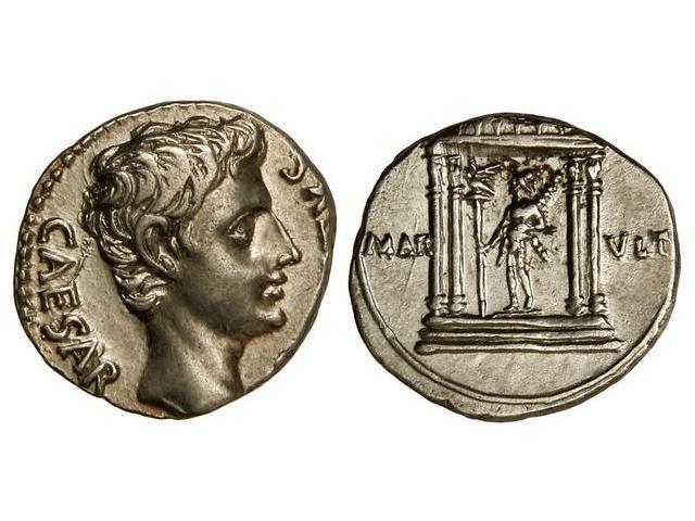 Roman Coins: Roman Empire - Denario. Acuñada el 19 a.C. AUGUSTO. COLONIA PATRICIA. Anv.: CAESAR (AVGVS)TVS. Cabeza descubierta a derecha. Rev.: Templo redondo tetrástilo, en medio Marte a izquierda sosteniendo águila legionaria, en el campo MAR-VLT. RARA ASÍ. C-194; Cal-770; FFC-148. EBC.