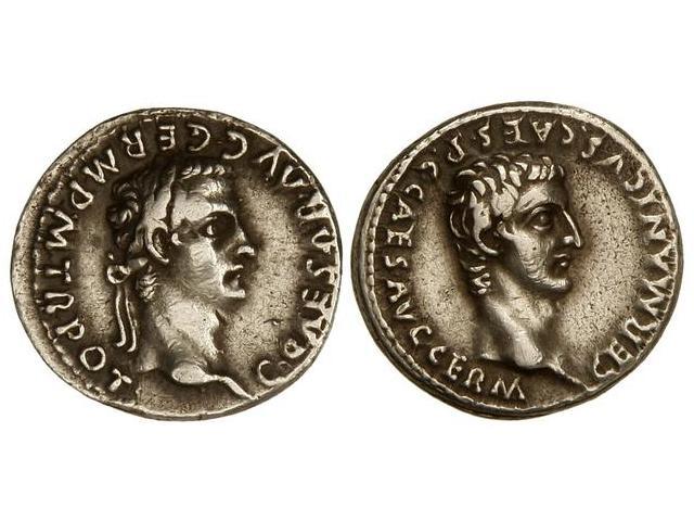 Roman Coins: Roman Empire - Denario. Acuñada el 37-38 d.C. CALÍGULA y GERMÁNICO. Anv.: C. CAESAR AVG. GERM. P. M. TR. POT. Cabeza laureada de Calígula a derecha. Rev.: GERMANICVS CAES. P. C. CAES. AVG. GERM. Cabeza descubierta de Germánico a derecha. RARA. C-4. EBC-.