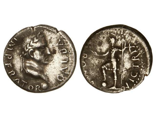 Roman Coins: Roman Empire - Denario. Acuñada el 68-69 d.C. GALBA. TARRACO. Anv.: GALBA IMPERATOR. Cabeza laureada a derecha, debajo globo. Rev.: ROMA VICTRIX. Roma en pie a izquierda con lanza y rama de olivo. (Rayitas en canto). AB-R117; JB-55. MBC+/MBC.