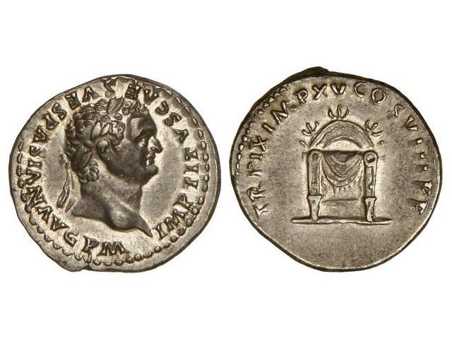 Roman Coins: Roman Empire - Denario. Acuñada el 79-80 d.C. TITO. Anv.: IMP. TITVS CAES. VESPASIAN AVG. P. M. Cabeza laureada a derecha. Rev.: TR. P. IX IMP. XV COS. VIII P. R. Trono con respaldo semicircular. C-313. EBC+.