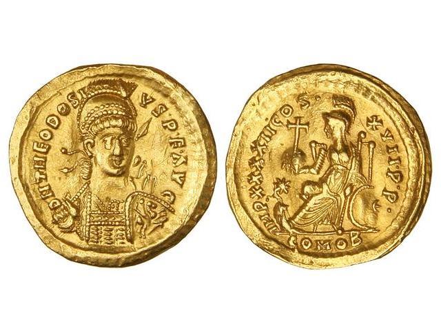 Roman Coins: Roman Empire - Sólido. 408-450 d.C. TEODOSIO II. CONSTANTINOPLA. Anv.: D. N. THEODOSIVS P. F. AVG. Busto de frente, con coraza y casco, portando lanza y escudo. Rev.: IMP. XXXXII COS. XVII P. P. Roma sentada a izquierda, portando cetro y globo crucífero, delante estrella. En exergo: CONOB. AU. (Cuatro pequeñas rayas). S-5. EBC-.