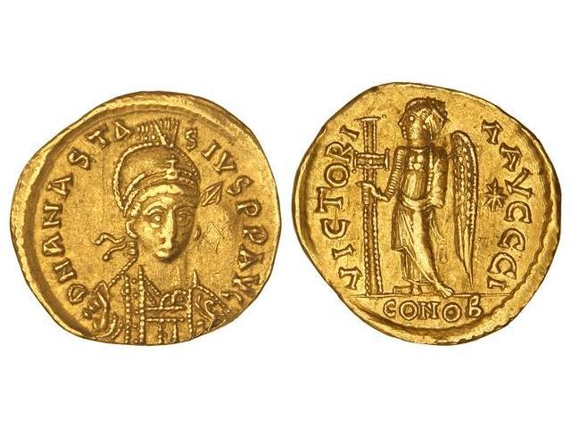 Roman Coins: Roman Empire - Sólido. Acuñada el 492-507 d.C. ANASTASIO I. CONSTANTINOPLA. Anv.: D. N. ANASTASIVS P. P. AVG. Busto de frente, con coraza y casco, portando lanza y escudo. Rev.: VICTORIA AVGGG I. Ángel en pie a izquierda, portando cruz, estrella en el campo. En exergo: CONOB. AU. (Grafiti en anverso. Golpecitos en canto). S-2. EBC-.