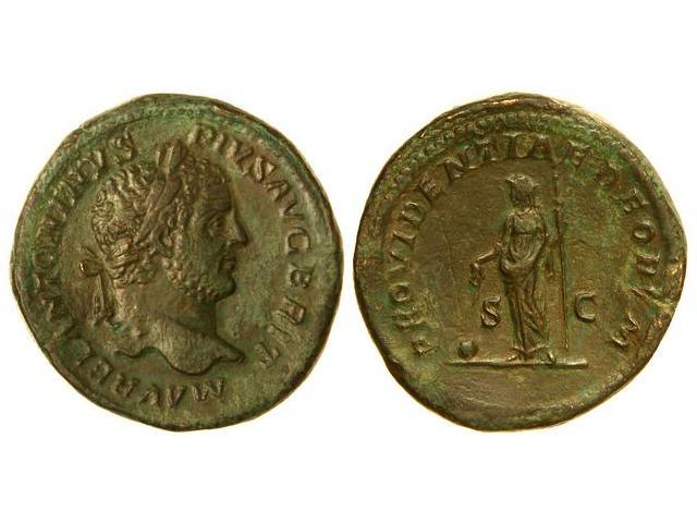 Roman Coins: Roman Empire - Sestercio. Acuñada el 210-213 d.C. CARACALLA. Anv.: M. AVREL. ANTONINVS PIVS AVG. BRIT. Busto laureado a derecha. Rev.: PROVIDENTIAE DEORVM S. C. Providencia en pie a izquierda. Pátina verde. BUEN EJEMPLAR. C-531. MBC+.