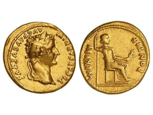 Roman Coins: Roman Empire - Áureo. Acuñada el 14-17 d.C. TIBERIO. Anv.: TI. CAESAR DIVI. AVG. F. AVGVSTVS. Busto laureado a derecha. Rev.: PONTIF. MAXIM. Livia sentada a derecha. 7,90 grs. AU. (Golpe en anverso). C-15; XC-305. MBC.