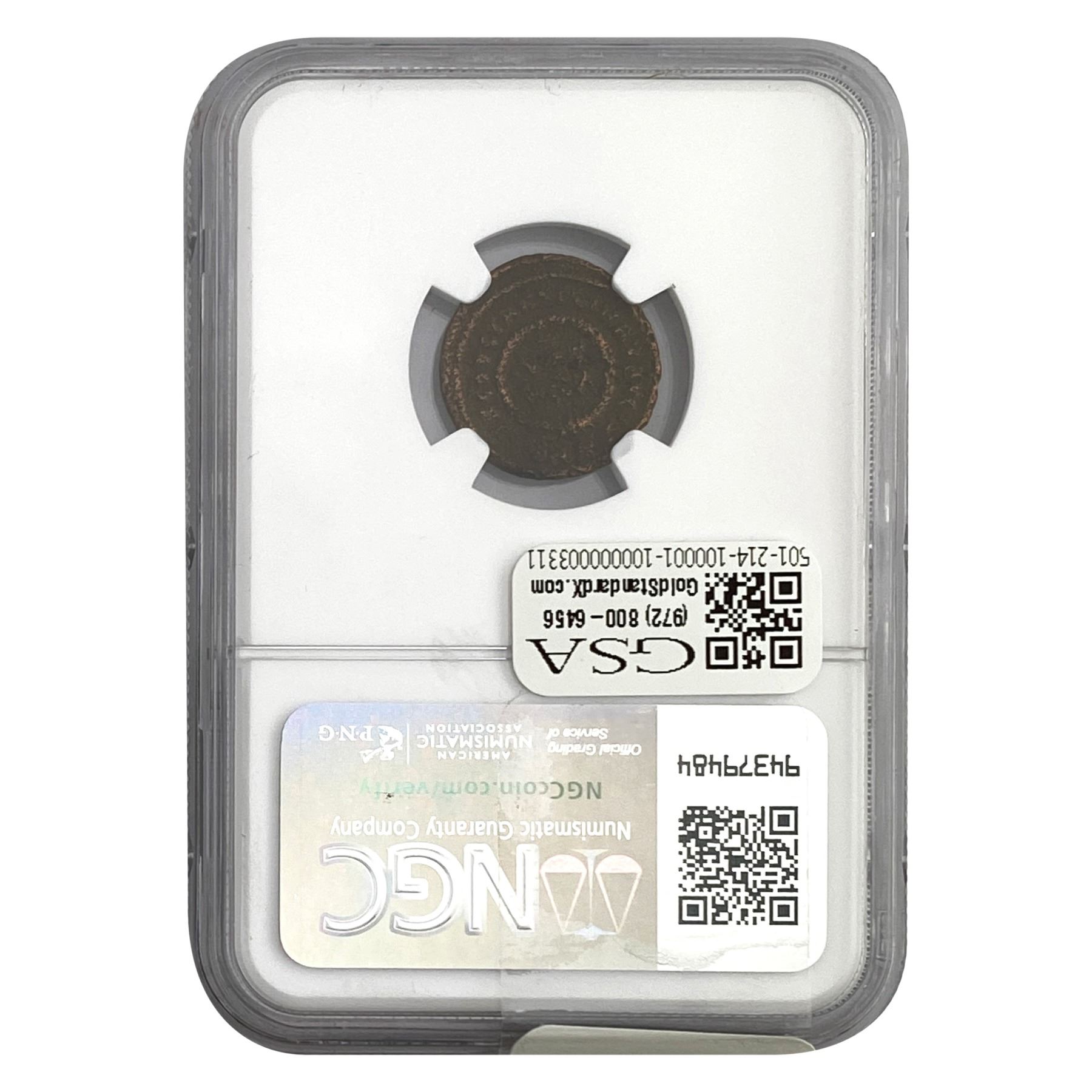 COINS AND CURRENCY LISTED IN GSA’S CATALOG AS GRADED AND ENCAPSULATED BY PCGS, NGC, ANACS, ICG, PCGS CURRENCY, PMG, PCGS BANKNOTE GRADING, CMC OR ANY OTHER THIRD-PARTY GRADING SERVICE ARE LIKEWISE SOLD “AS-IS” EXCEPT AS EXPRESSLY SET FORTH HEREIN. ALL THIRD-PARTY GRADING SERVICE GUARANTEES, INCLUDING AUTHENTICITY, ARE THE SOLE RESPONSIBILITY OF THE THIRD-PARTY GRADING SERVICE AND NOT WARRANTIES OR GUARANTEES OF GSA. BIDDERS SHOULD CONTACT THESE THIRD-PARTY GRADING SERVICES DIRECTLY WITH RESPECT TO ANY CLAIMS OR QUESTIONS THEY MAY HAVE CONCERNING THEIR GUARANTEES AND WARRANTIES. BIDDERS ACKNOWLEDGE AND AGREE THAT AUCTIONEER IS NOT BOUND BY OR LIABLE FOR ANY OPINION OR CERTIFICATION BY ANY THIRD-PARTY GRADING SERVICE. REMOVAL OF A PRODUCT FROM ITS PROTECTIVE CASING OR HOLDER OR ALTERATION OF ANY COIN HOLDER WAIVES ALL RIGHTS CONCERNING THE PRODUCT CONTAINED THEREIN.