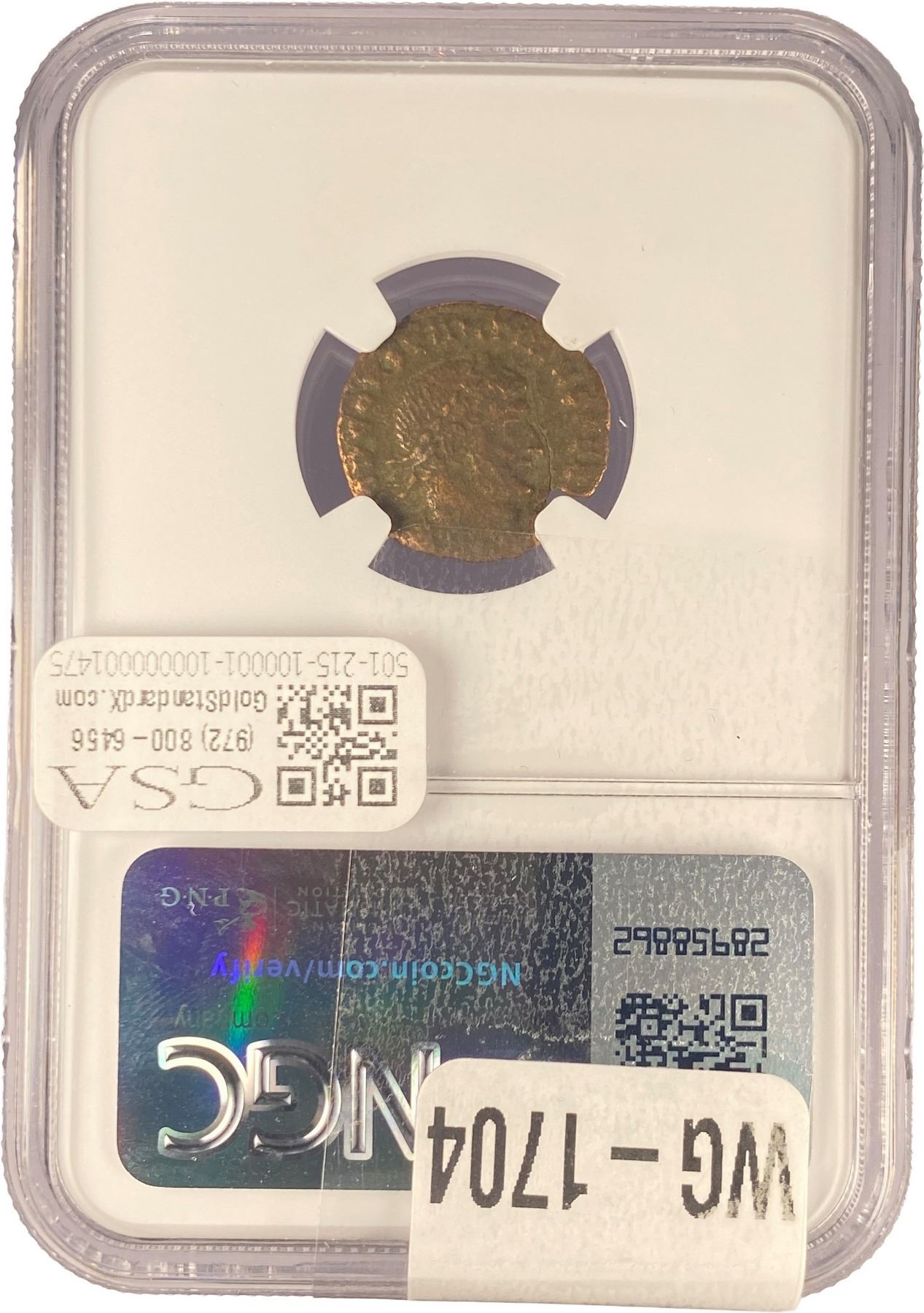e. Coins sold referencing a third-party grading service are sold “AS IS” without any express or implied warranty, except for a guarantee by GSA that they are genuine. Removal or alteration of the holder, voids all of Bidder’s claims concerning that Product. Certain warranties may be available from the grading services and Bidders are referred to them for further details: Numismatic Guaranty Corporation (NGC), PO Box 4776, Sarasota, FL 34230, www.ngccoin.com/services/writtenguarantee.asp; Professional Coin Grading Services (PCGS), PO Box 9458, Newport Beach, CA 92658, www.pcgs.com/guarantee.html; ANACS, 6555 S. Kenton St., Ste. 303, Englewood, CO 80111; and Independent Coin Grading Co. (ICG), 7901 East Bellview, Ave., Suite 50, Englewood, CO 80111.