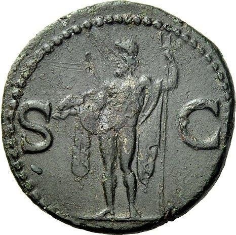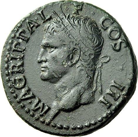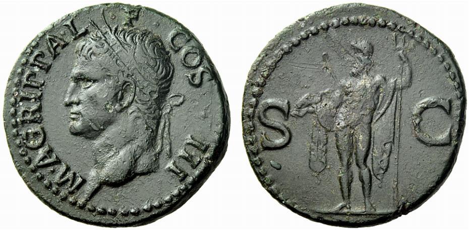 The Roman Empire, In the name of Agrippa, As 37, Æ 11.19 g. Head l., wearing rostral crown. Rev. Neptune standing l., holding small dolphin and trident. C 3. BMC Tiberius 161. RIC Gaius 58. CBN Gaius 78. Dark green patina, two light scratches on reverse, otherwise good very fine