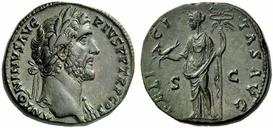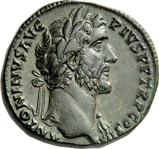 The Roman Empire, Antoninus Pius augustus, 138 – 161, Sestertius 140-144, Æ 25.80 g. Laureate head r., drapery on far shoulder. Rev. Felicitas standing l., holding capricorn in extended r. hand and branch in l. C –, cf. 362. BMC –, cf. 1335. RIC -, cf. 680. Lovely green patina and extremely fine Ex NAC sale 29, 2005, 547.