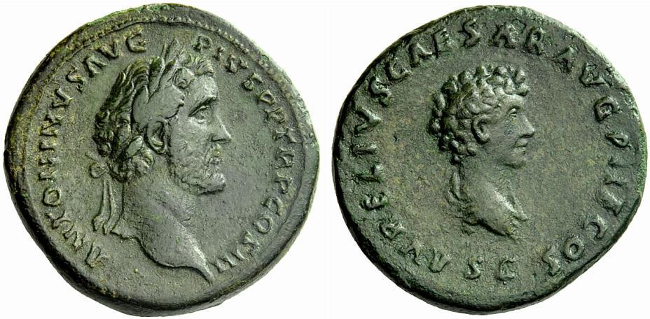 The Roman Empire, Antoninus Pius augustus, 138 – 161, Sestertius 140-144, Æ 27.86 g. Laureate head of A. Pius r. Rev. Bare-headed and draped bust of M. Aurelius r. C 34. BMC 1209. RIC 1212. Green patina somewhat tooled on reverse, otherwise very fine