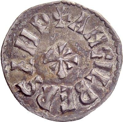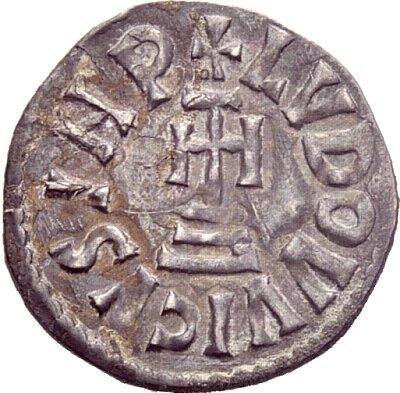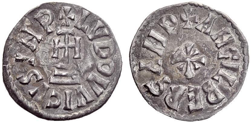 Late Roman Empire. The Lombards. Benevento. Second period: Princes of Benevento, 774-878. Adelchis, 853-878. Second period: issues with the name of Louis II and Angilberga, 866-871. Denarius, AR 0.95 g. + LVDOVVICVS INP Cross potent on three steps. Rev. + ANGILBERGA NP Cross in saltire. CNI 42. Sambon Repertorio 460. MEC 1, 1116. Dark tone and about extremely fine
