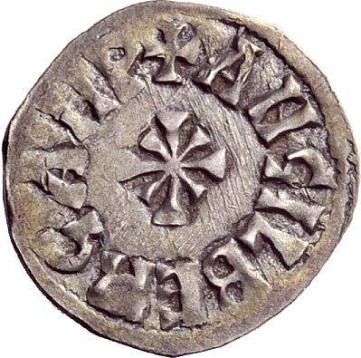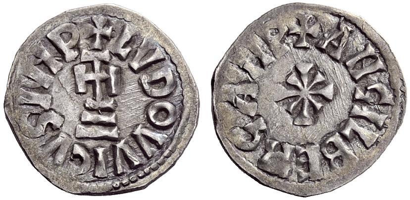 Late Roman Empire. The Lombards. Benevento. Second period: Princes of Benevento, 774-878. Adelchis, 853-878. Second period: issues with the name of Louis II and Angilberga, 866-871. Denarius, AR 1.00 g. + LVDOVVICVS INP Cross potent on three steps. Rev. + ANGILBERGA NP Cross in saltire. CNI 42. Sambon Repertorio 460. MEC 1, 1116. Lightly toned and about extremely fine