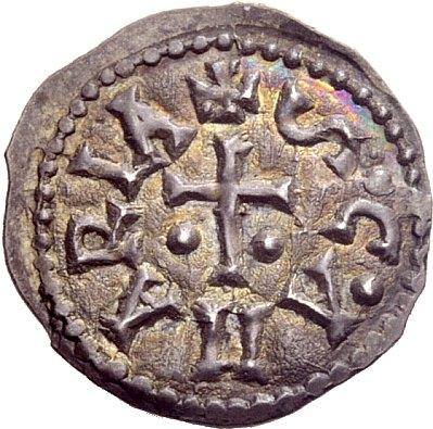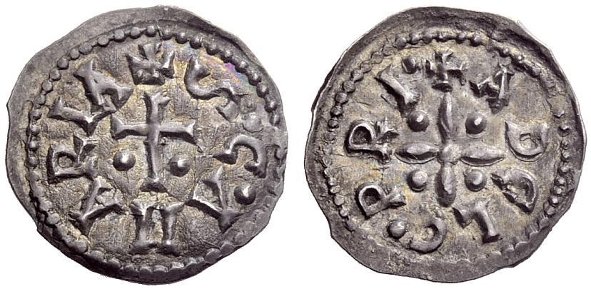 Late Roman Empire. The Lombards. Benevento. Second period: Princes of Benevento, 774-878. Adelchis, 853-878. First period: as sole ruler, 853-867. Denarius, AR 1.03 g. + ADELC•PRI• Cross quartered with four pellets. Rev. + S•C•AMARIA Latin cross; at base, two pellets. CNI 8. Sambon Repertorio –. Mec 1, –. Extremely rare. Old cabinet tone and extremely fine