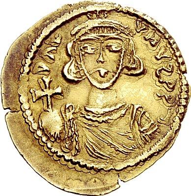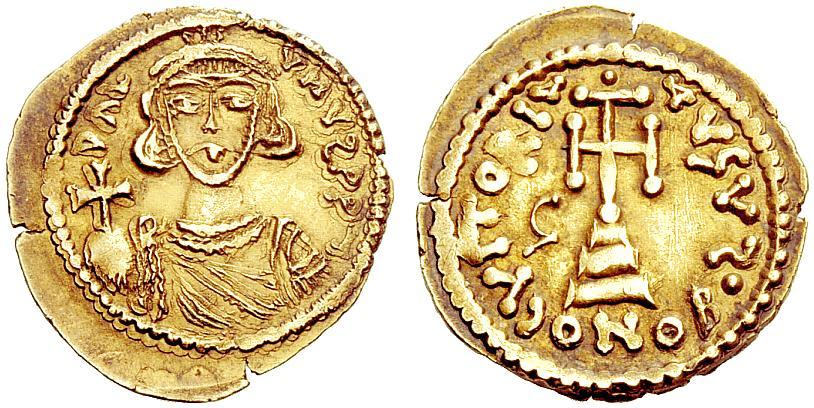 Late Roman Empire. The Lombards. Benevento. First period: dukes of Benevento, 706-774. Gregory, 732-739. Solidus in the type of Justinian II, AV 4.10 g. DLL – VÈV¨PPØ Diademed bust facing, holding globus cruciger in r. hand. Rev. VITORIs – • – sVGV¨• Cross potent on globe set on three steps; in l. field, G and in exergue, ÉONOB. CNI 26 var. Sambon Repertorio 390. Oddy 402. MEC 1, 1089 var. Friedberg 87. Rare. Extremely fine