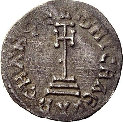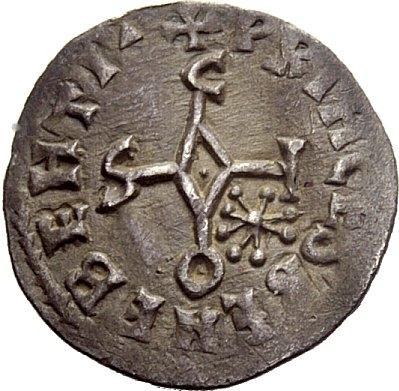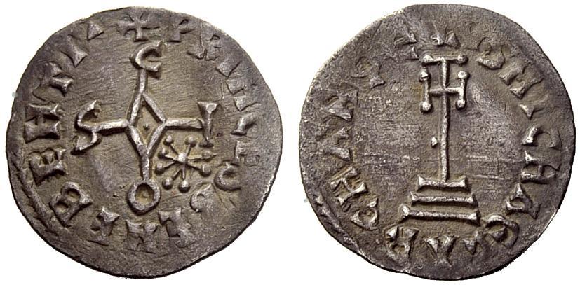 Late Roman Empire. The Lombards. Benevento. Second period: Princes of Benevento, 774-878. Sico, 817-832. Denarius, AR 1.25 g. + PRINCES BENEBEHTIr around the letters SICO in the shape of a cross; star in fourth quarter. Rev. ARHANGELVS NICHAEL• Cross potent set on three steps; in l. field, pellet. CNI 11 var. Sambon Repertorio 435. MEC 1, 1107. Old cabinet tone, flan somewhat wavy, otherwise very fine