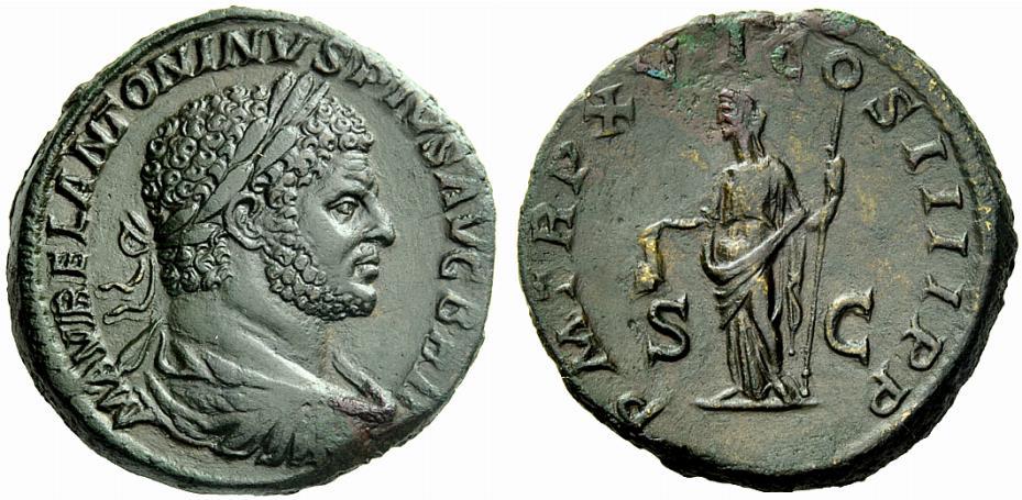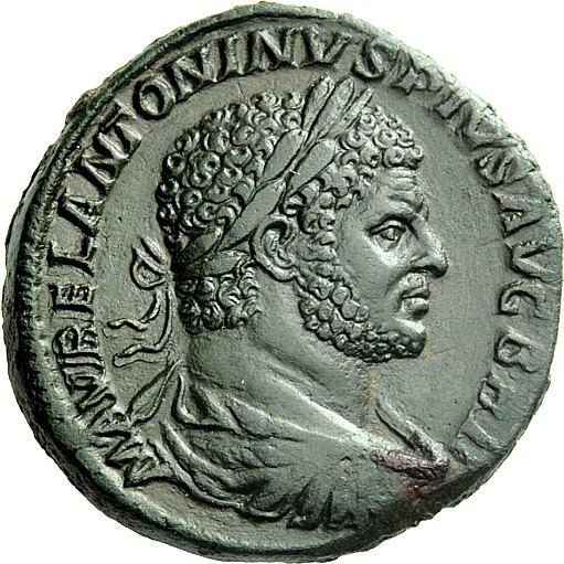 The Roman Empire, Caracalla augustus, 198 – 217, Sestertius 213, Æ 23.60 g. Laureate, draped and cuirassed bust r. Rev. Liberalitas standing l., holding pileus and rod. C 229. BMC 246. RIC 498a. A bold portrait with a pleasant dark green patina, gently smoothed on reverse, otherwise about extremely fine
