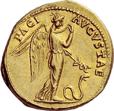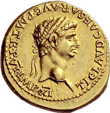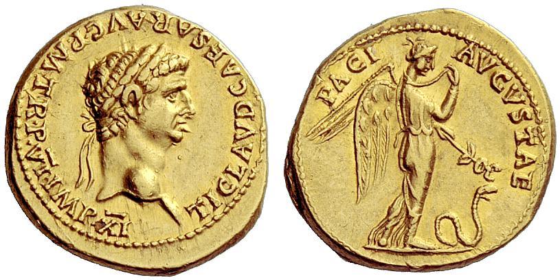 The Roman Empire, Claudius, 50 – 54, Aureus 46-47, AV 7.73 g. TI CLAVD CAESAR AVG P M TR P VI IMP XI Laureate head r. Rev. PACI – AVGVSTAE Pax-Nemesis advancing r., holding caduceus in l. hand pointing at snake and raising fold of drapery below chin. C 57. RIC 38. BMC 39. CBN 49. Calicó 367. A magnificent portrait well struck in high relief. Virtually as struck and almost Fdc