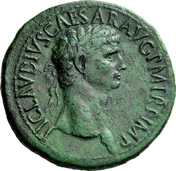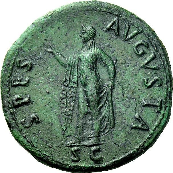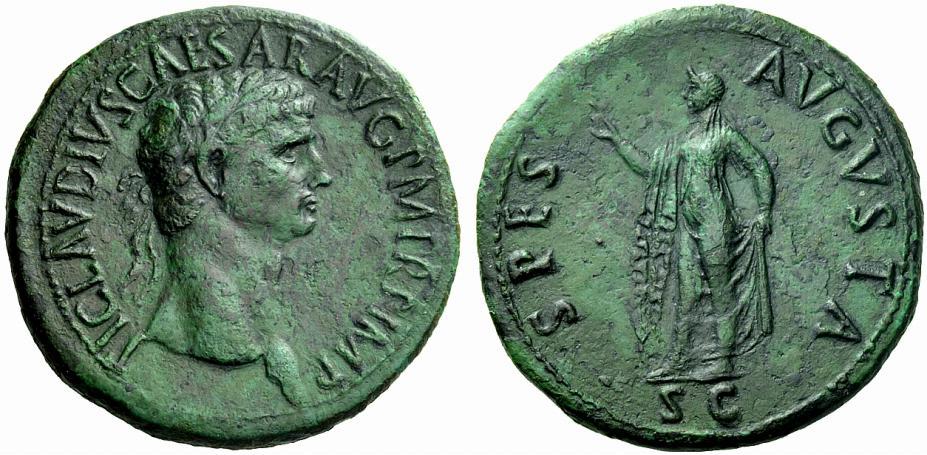 The Roman Empire, Claudius, 41 – 54, Sestertius 41-50, Æ 26.37 g. Laureate head r. Rev. Spes advancing l., holding flower and raising skirt. C 85. BMC 124. RIC 99. CBN 167. Struck on a very broad flan, green patina with minor porosity, otherwise good very fine