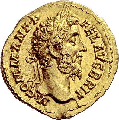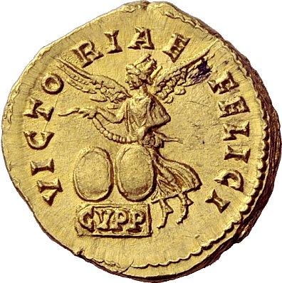 The Roman Empire, Commodus sole augustus, 180 – 192, Aureus 186-189, AV 7.21 g. M COMM ANT P – FEL AVG BRIT Laureate head r. Rev. VICTO – RIAE – FELICI Victory, turreted, flying l., holding diadem in both hands; below, two shields and tablet inscribed C V P P). C –, cf. 952 (denarius). BMC –, cf. 240 (denarius). RIC –, cf. 196 (denarius). Calicó 2360a (these dies). Coin Hoard II p. 66, fig 15, 6 (these dies). Exceedingly rare, only the fourth specimen known. Virtually as struck and almost Fdc Ex Leu sale 87, 2003, Perfectionist, 41. When this aureus was struck, sometime after his fifth consulship on January 1, 86, Commodus must have had a fresh and wary perspective on the hazards of being emperor. The previous year had begun well enough: on the heels of a swift victory in Britain, Commodus began to celebrate the vows for his decennalia, or tenth year of power; he even went so far as to describe the event as the dawn of a new golden age, which he inaugurated with the Primi Decenales games. However, the celebratory atmosphere was quickly tarnished with the revolt in that same year of his praetorian prefect Perennis, who intended to replace Commodus as emperor with his own son. It was a serious coup that shook his confidence, and that required him to pay a largess to the army (which he honoured with special coin types, including one depicting the emperor haranguing the troops). This fiasco was followed in 286 with a guerilla war in Spain and Gaul led by a deserter named Maternus, who in the following year came to Rome in disguise to murder Commodus, and who might have succeeded had he not been betrayed the day before he intended to strike. With so much treachery about his person, Commodus could hardly have been enjoying his lot as emperor, and the rather festive appearance of this aureus, inscribed C. V. P. P. for Consul V Pater Patriae, represented the bright side of his otherwise perilous life.