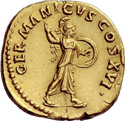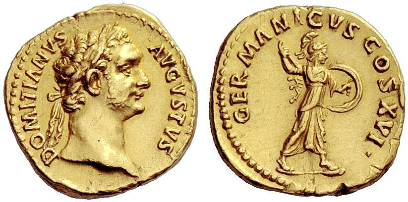 The Roman Empire, Domitian augustus, 81 – 96, Aureus 92-94, AV 7.47 g. DOMITIANVS – AVGVSTVS Laureate head r. Rev. GERMANICVS COS XVI Minerva advancing r., holding spear and shield. C 158. BMC p. 939 note *. RIC 743. CBN –. Calicó 848. A pleasant portrait. Several marks on edge and in field, otherwise extremely fine