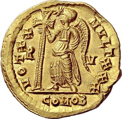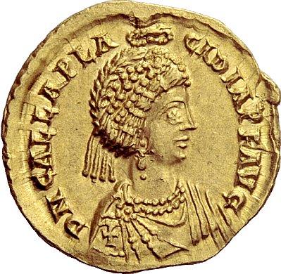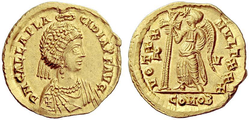 Late Roman Empire. Galla Placidia, mother of Valentinian III. Solidus, Ravenna 426-430, AV 4.43 g. D N GALLA PLA – CIDIA P F AVG Pearl-diademed and draped bust r., wearing necklace and crowned above by the hand of God; Christogram on shoulder. Rev. VOT XX – MVLT XXX R – V Victory standing l., supporting long jewelled cross; in upper field, star. In exergue, COMOB. C 13. RIC Valentinian 2012. LRC 826. Depeyrot 13/2. Ranieri 73. Extremely fine