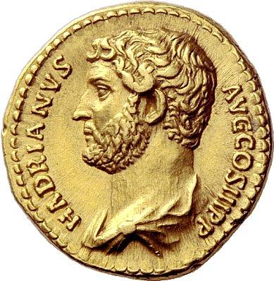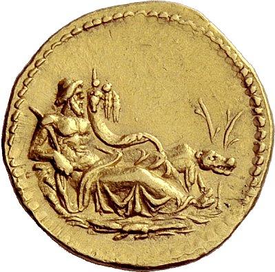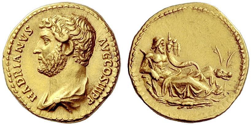 The Roman Empire, Hadrian 117 – 138, Aureus 134-138, AV 7.36 g. HADRIANVS – AVG COS III P P Bare-headed and draped bust l. Rev. Nilus naked to waist reclining r., leaning l. arm on rock and holding cornucopiae and reed; before him, hippopotamus standing r. and below, crocodile over waves. C 1499. BMC 836 note. RIC 314. Kent-Hirmer pl. 81, 284 (these dies). Biaggi 671 (this coin). Calicó 1165 (this coin). Very rare. A delightful portrait of masterly style struck on a full flan, extremely fine / about extremely fine Ex Cahn 75, 1932, 1150; Santamaria 1950, Magnaguti 632 and Sotheby’s 8 June 1996, 109, sales.