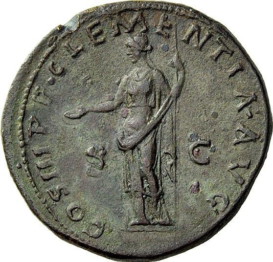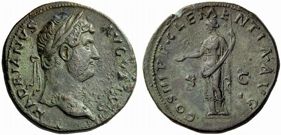 The Roman Empire, Hadrian augustus, 117 – 138, Sestertius 132-134, Æ 20.89 g. Laureate head r. Rev. Clementia standing l., holding patera and sceptre. C 511. BMC 1383. RIC 701. Brown-green patina with some encrustation and very fine
