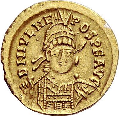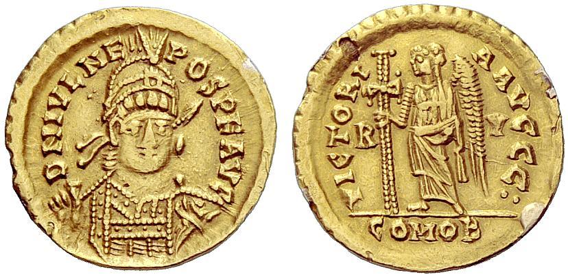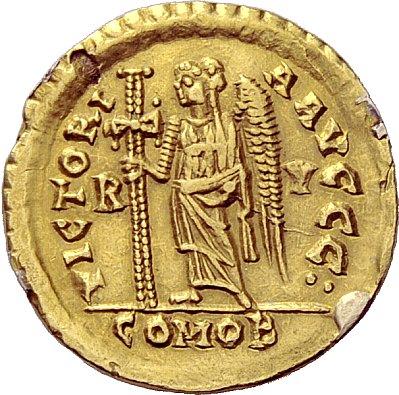 The Roman Empire, Julius Nepos, 19th June 474 – 28th August 475, Solidus, Ravenna 474-475, AV 4.35 g. D N IVL NE – POS P F AVG Helmeted, pearl-diademed and cuirassed bust three-quarters r. facing, holding spear and shield with horseman and enemy motif. Rev. VICTORI – A AVGGG: Victory standing l., supporting long jewelled cross; in fields, R – V. In exergue, COMOB. C 6. RIC 3212. Lacam 18/20. Depeyrot 41/1. LRC 939. Ranieri 181. Very rare. Several traces on edge, possibly traces of mounting, otherwise very fine