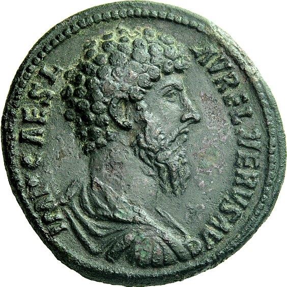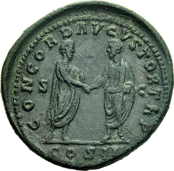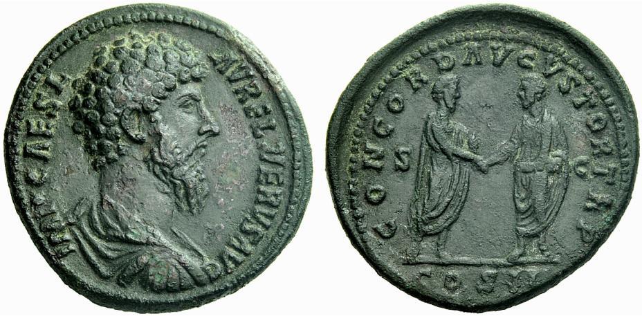 The Roman Empire, Lucius Verus augustus, 161 – 169, Sestertius 161, Æ 24.61 g. Bare-headed, draped and cuirassed bust r. Rev. M. Aurelius and L. Verus clasping hands. C 27. BMC 858. RIC 1282. Dark green patina and good very fine Ex NAC sale 51, 2009, 1043