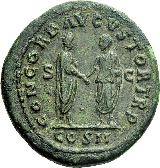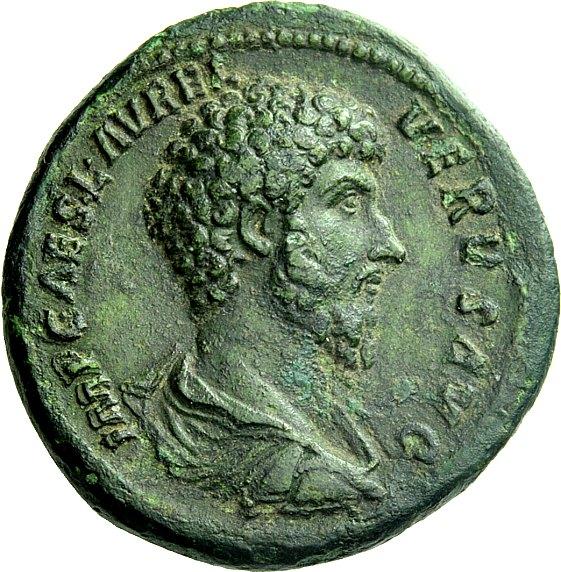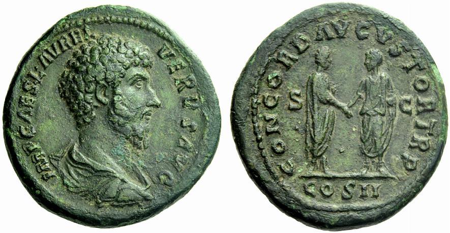 The Roman Empire, Lucius Verus augustus, 161 – 169, Sestertius 161, Æ 23.13 g. Bare-headed draped and cuirassed bust r. Rev. M. Aurelius and L. Verus standing facing each other, clasping hands. C 27. BMC 858. RIC 1282. Green patina and very fine