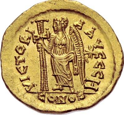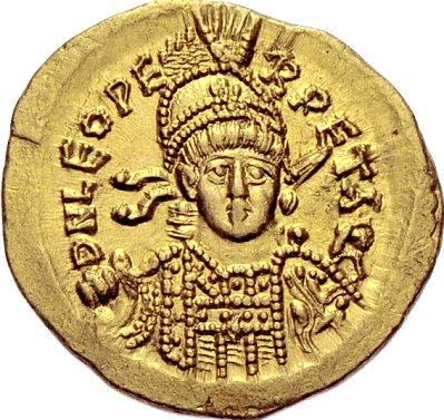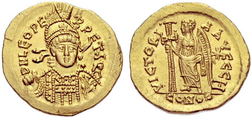 Late Roman Empire. Leo I, 457 – 474. Solidus, Constantinopolis circa 462 or 466, AV 4.42 g. D N LEO PE – RPET AVG Helmeted, pearl-diademed and cuirassed bust facing three-quarters r., holding spear and shield with horseman and enemy motif. Rev. VICTORI – A AVGGH Victory standing l., supporting long jewelled cross; in r. field, star and in exergue, CONOB. RIC 605. MIRB 3b. Depeyrot 93/1. LRC 518. Good extremely fine