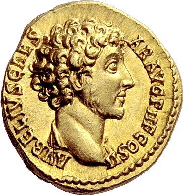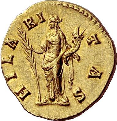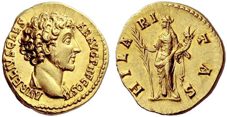 The Roman Empire, Marcus Aurelius, 139 β 161, Aureus 145-147, AV 7.26 g. AVRELIVS CAES βAR AVG PII F COS II Bare head r., with drapery on shoulders. Rev. HILA β RI β TAS Hilaritas standing l., holding long palm branch and cornucopiae. C 233 var. (no drapery). BMC A. Pius 607. RIC A. Pius 432b. Calicó 1861. Virtually as struck and almost Fdc Ex Triton II, 1998, 914 and NAC 24, 2002, European Nobleman, 100 sales.