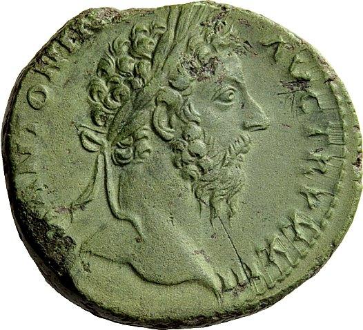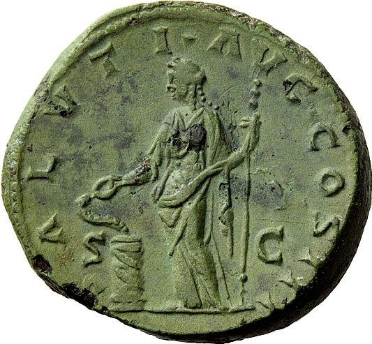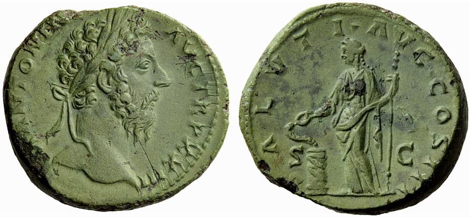 The Roman Empire, Marcus Aurelius augustus, 161 – 180, Sestertius 168-169, Æ 26.63 g. Laureate head r. Rev. Salus standing l., holding spear and feeding out of patera snake coiled round altar. C 544. BMC 1351. RIC 964. Attractive light green patina and very fine
