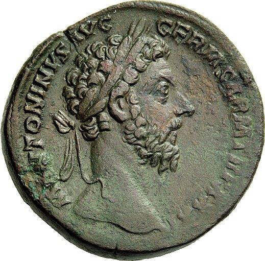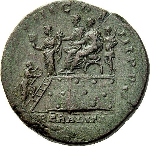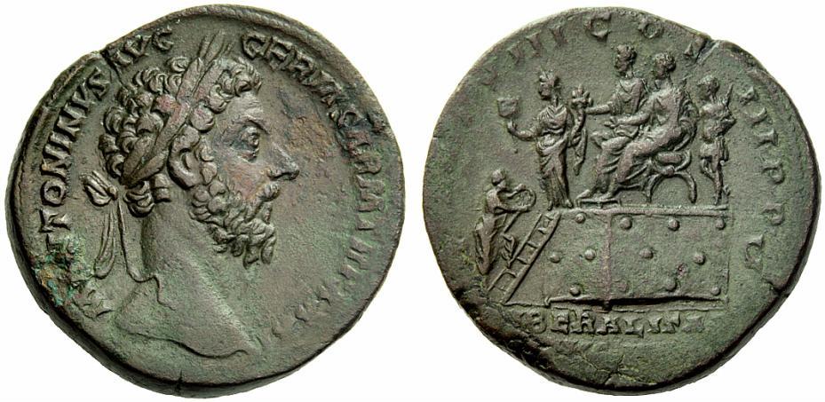The Roman Empire, Marcus Aurelius augustus, 161 – 180, Sestertius 176-177, Æ 25.00 g. Laureate head r. Rev. M. Aurelius and Commodus seated l. on platform; behind them, officer holding sceptre. To l., Liberalitas standing l., holding abacus. Below, citizen mounting steps, holding out fold of toga in both hands. C 424. BMC 1606. RIC 1208. Very rare. Brown tone, flan crack, otherwise good very fine Ex NAC sale 51, 2009, 1029.