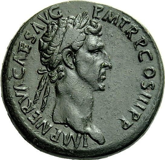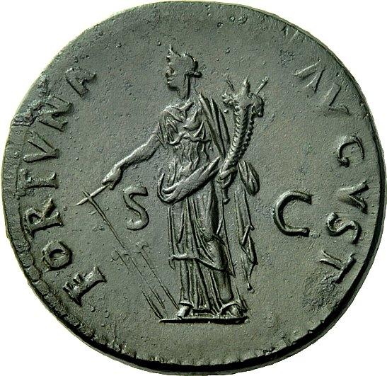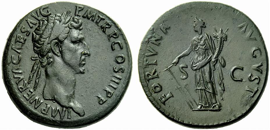 The Roman Empire, Nerva, 96 – 98, Sestertius 97, Æ 23.57 g. IMP NERVA CAES AVG P M TR P COS III P P Laureate head r. Rev. FORTVNA – AVGVST S – C Fortuna standing l., holding rudder and cornucopiae. C 67. BMC 108. RIC 83. CBN 98. Enamel-like dark green patina, minor weakness, otherwise about extremely fine Ex NAC sale 51, 2009, 252.