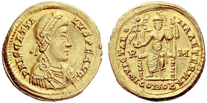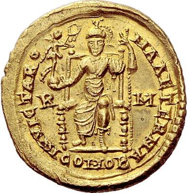 Late Roman Empire. Priscus Attalus, 409 – 410. Solidus 409-410, AV 4.46 g. IMP PRIS AT – TALVS P F AVG Pearl-diademed, draped and cuirassed bust r. Rev. INVICTA RO – MA AETERNA Roma seated facing on throne, holding Victory on globe and reversed spear; in field, R – M and in exergue COMOB. C 3. RIC 1404. LRC 812. Depeyrot 39/1. Exceedingly rare and among the finest specimens known. Well struck on a full flan and extremely fine. Ex Rauch sale 82, 2008, 662 (illustrated on the cover page).