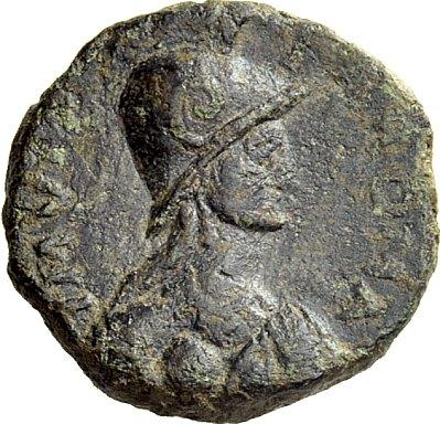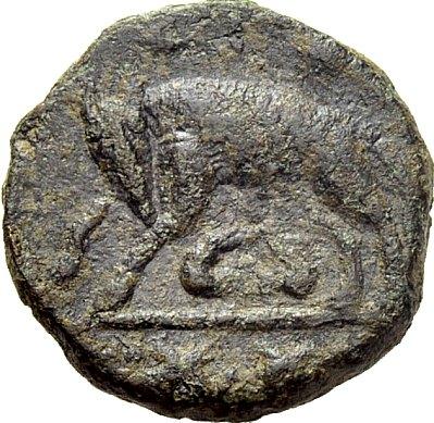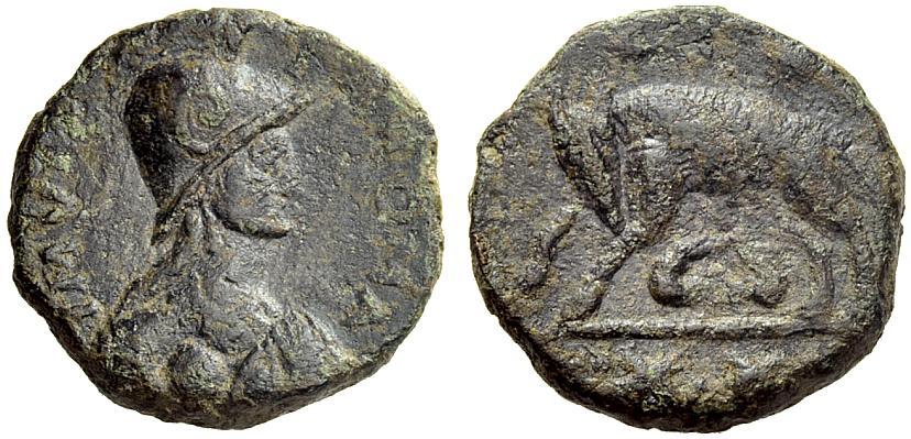Late Roman Empire. The Ostrogoths. Municipal bronze coinage of Roma. 20 nummi 493-553, Æ 6.51 g. Helmeted bust of Roma r. Rev. She wolf with twins to l.; above, XL. In exergue, IIII. MIB 70. MEC 1, 97. Metlich 84 (Atalaric). Dark green patina and about very fine.