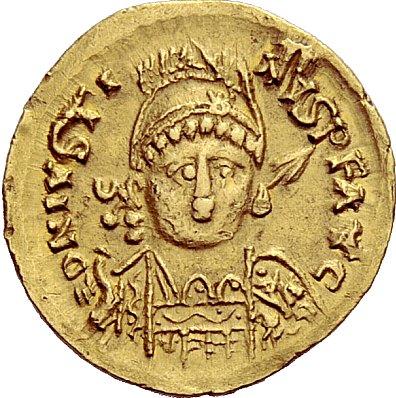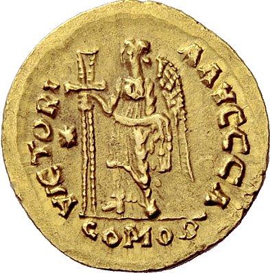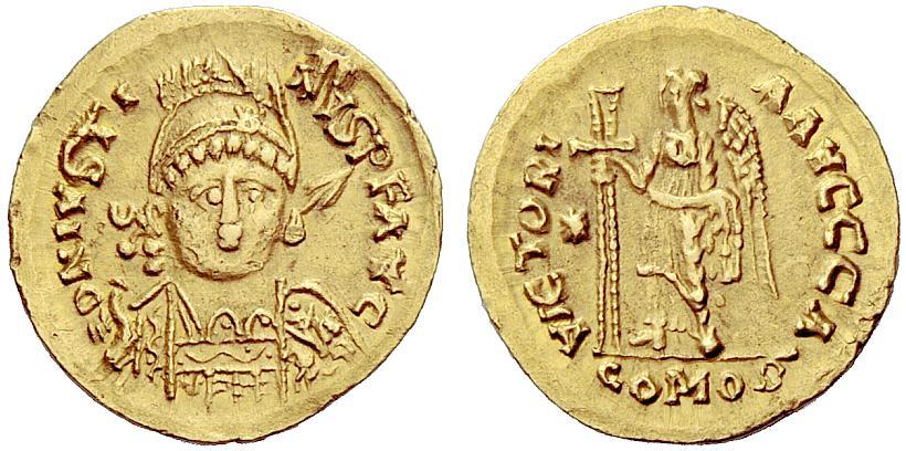 Late Roman Empire. The Ostrogoths. Athalaric, 526-534. In the name of Justin, 518-527. Solidus, Rome 526-527, AV 4.43 g. D N IVSTI – NVS P F AVG Helmeted, pearl-diademed and cuirassed bust facing three-quarters r., holding spear and shield with horseman and enemy motif. Rev. VICTORI – A AVGGGA Victory standing l., holding long jewelled cross; in l. field, star and in exergue, COMOB. MIB 24. MEC 1, –. Metlich 32. Traces of mounting, otherwise good very fine