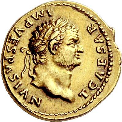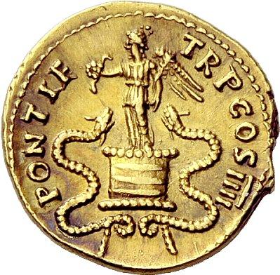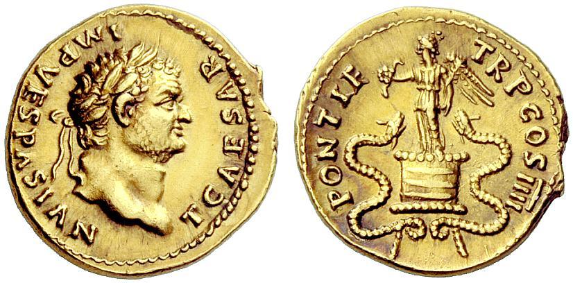 The Roman Empire, Titus caesar, 69 – 79, Aureus 75, AV 7.30 g. T CAESAR IMP VESPASIAN Laureate head r. Rev. PONTIF – TR P COS IIII Victory standing l. on cista mistica, holding wreath in r. hand and palm in l.; on either side, coiled snake. C 163. BMC Vespasian 173. RIC Vespasian 785. CBN Vespasian 151. Calicó 750. Struck in high relief with a magnificent reddish tone and good extremely fine Ex M&M sale 19, 1959, 197. From the Boscoreale hoard of 1895.