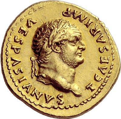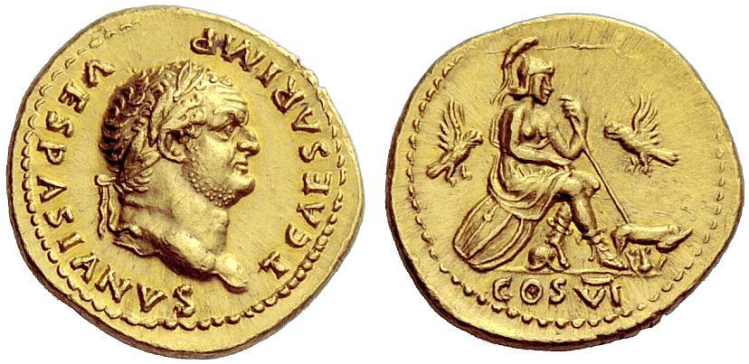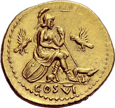 The Roman Empire, Titus caesar, 69 – 79, Aureus 77-78, AV 7.34 g. T CAESAR IMP VESPASIANVS Laureate head r. Rev. Roma seated r. on shields, l. foot over helmet, holding spear in l. hand; on either side, a bird. Before her, she-wolf with twins and in exergue, COS VI. C 64. BMC Vespasian 223. RIC Vespasian 954. CBN Vespasian 197. Calicó 738a (this coin). Good extremely fine Ex Leu sale 65, 1996, 349.