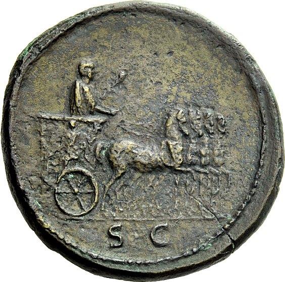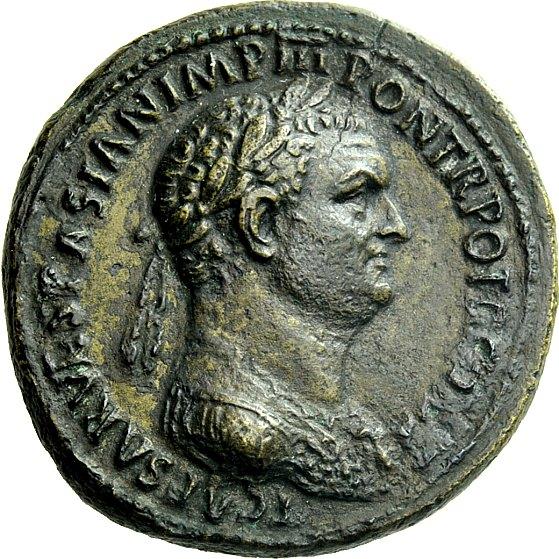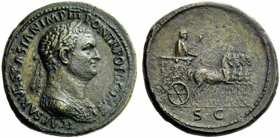 The Roman Empire, Titus caesar, 69 – 79, Sestertius July-December 72, Æ 28.59 g. T CAESAR VESPASIAN IMP III PONT TR POT II COS II Laureate and cuirassed bust r., with aegis. Rev. Titus, holding olive branch and human-headed sceptre, on triumphal quadriga r.; on side of car, figure of Titus placing r. hand on head of captive and holding palm branch in l. In exergue, S C. C 231. BMC Vespasian 650 pl. 26, 1 (these dies). RIC Vespasian 476. CBN Vespasian 641 var. (cuirassed only). Extremely rare. A very attractive and realistic portrait in the finest style of the period. Brown tone somewhat porous and a flan crack at one o’clock on obverse, otherwise about extremely fine / good very fine Ex NAC sale 4, 1991, 343.