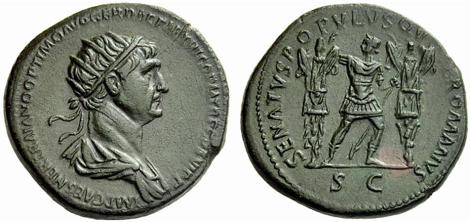 The Roman Empire, Trajan, 98 – 117, Dupondius 116-117, Æ 14.18 g. IMP CAES NER TRAIANO OPTIMO AVG GER DAC PARTHICO P M TR P COS VI P P Radiate and draped bust r. Rev. SENATVS POPVLVSQVE ROMANVS Trajan standing facing, head l., between two trophies, holding spear; in exergue, S C. C 356. BMC 1052. RIC 676. CBN 926. A superb green patina and an unobtrusive scratch on obverse field, otherwise extremely fine Ex Lanz sale 125, 2005, 732.