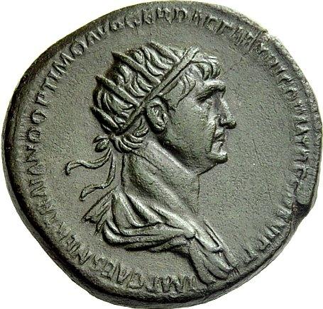 The Roman Empire, Trajan, 98 – 117, Dupondius 116-117, Æ 14.18 g. IMP CAES NER TRAIANO OPTIMO AVG GER DAC PARTHICO P M TR P COS VI P P Radiate and draped bust r. Rev. SENATVS POPVLVSQVE ROMANVS Trajan standing facing, head l., between two trophies, holding spear; in exergue, S C. C 356. BMC 1052. RIC 676. CBN 926. A superb green patina and an unobtrusive scratch on obverse field, otherwise extremely fine Ex Lanz sale 125, 2005, 732.