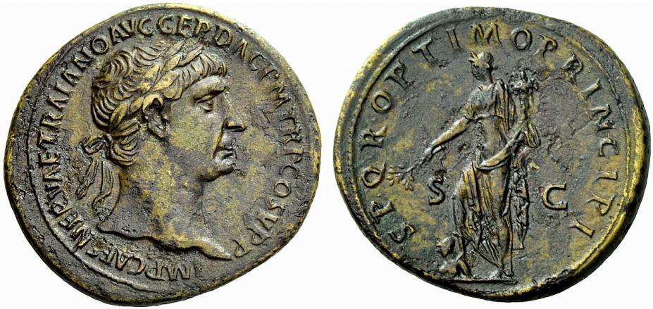 The Roman Empire, Trajan, 98 – 117, Sestertius 103-111, Æ 26.07 g. Laureate head r. Rev. Fortuna standing l., foot on Dacian, holding branch and cornucopiae. C 407. BMC 801. RIC 503. Struck on a broad flan with minor porosity and good very fine