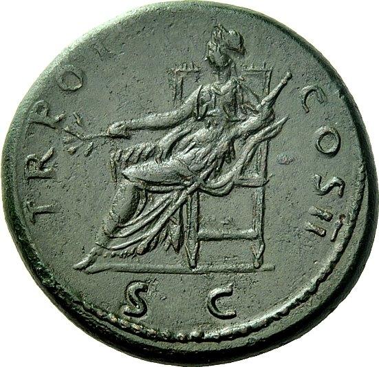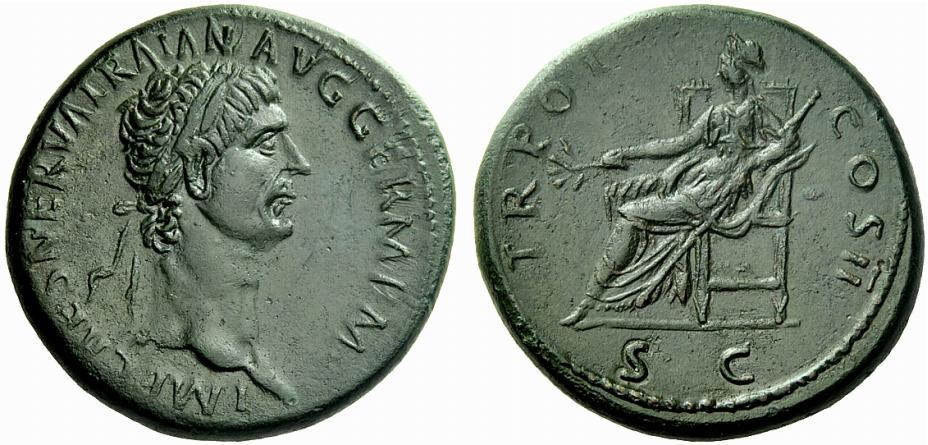 The Roman Empire, Trajan, 98 – 117, Sestertius 98-99, Æ 25.13 g. Laureate head r. Rev. Pax seated l., holding branch and sceptre. C 611 var. (Iustitia). BMC 715. RIC 390. CBN 29. Dark green patina and about extremely fine Ex H.D. Rauch 80, 2007, 125 and NAC 51, 2009, 941 sales.