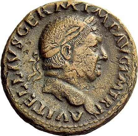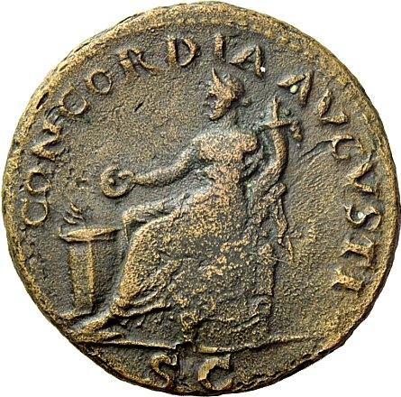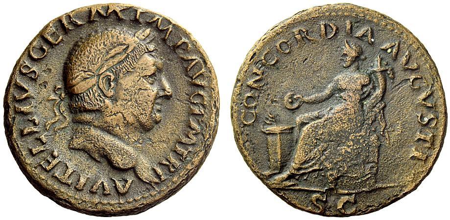 The Roman Empire, Vitellius, 2nd January – 20th December 69 (recognised Emperor in Rome on 19th April), As late April-December 69, Æ 10.28 g. Laureate head r. Rev. Concordia seated l., holding cornucopiae and patera over lighted altar. C 14. BMC 72. RIC 171. CBN –. About very fine