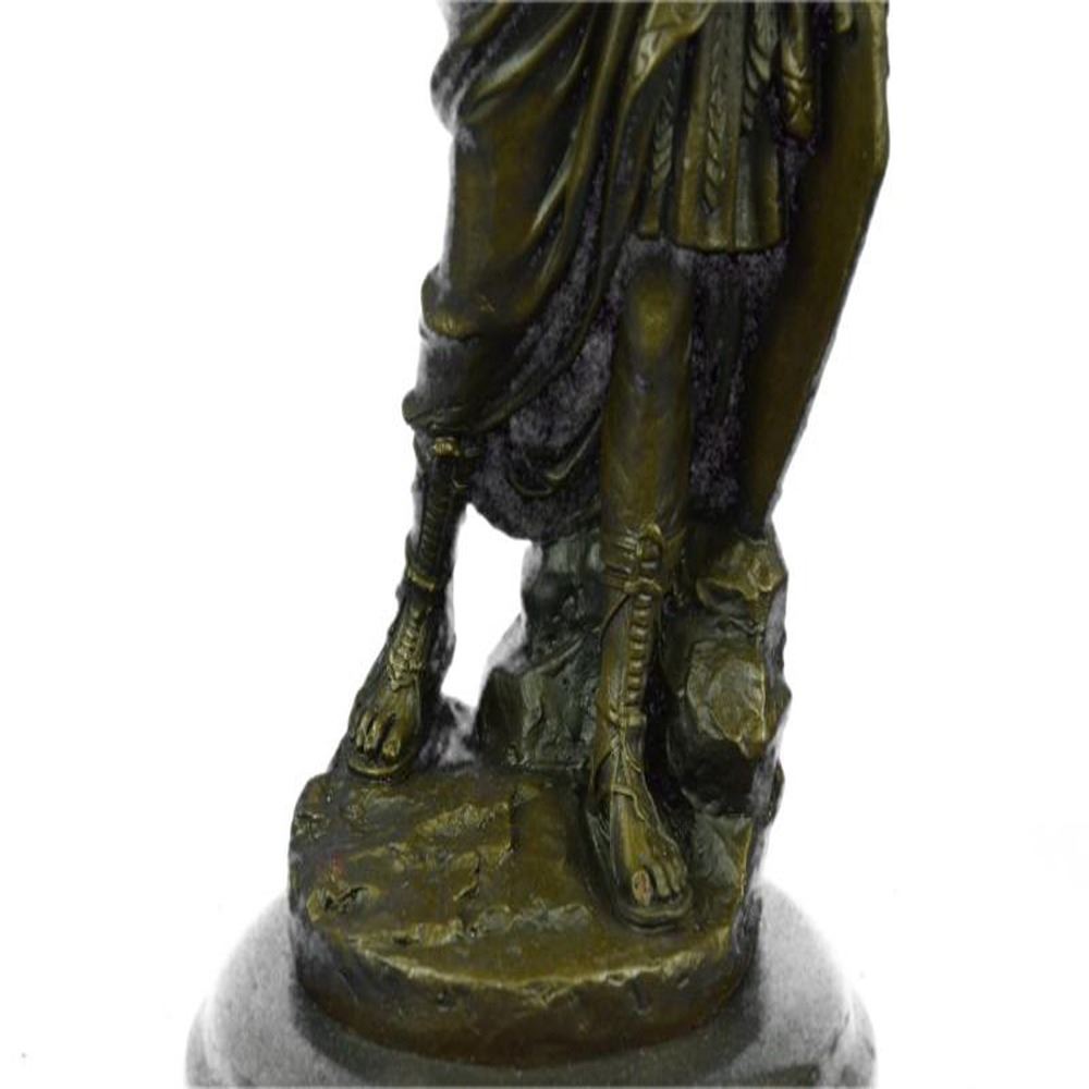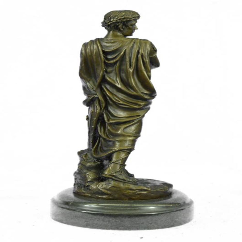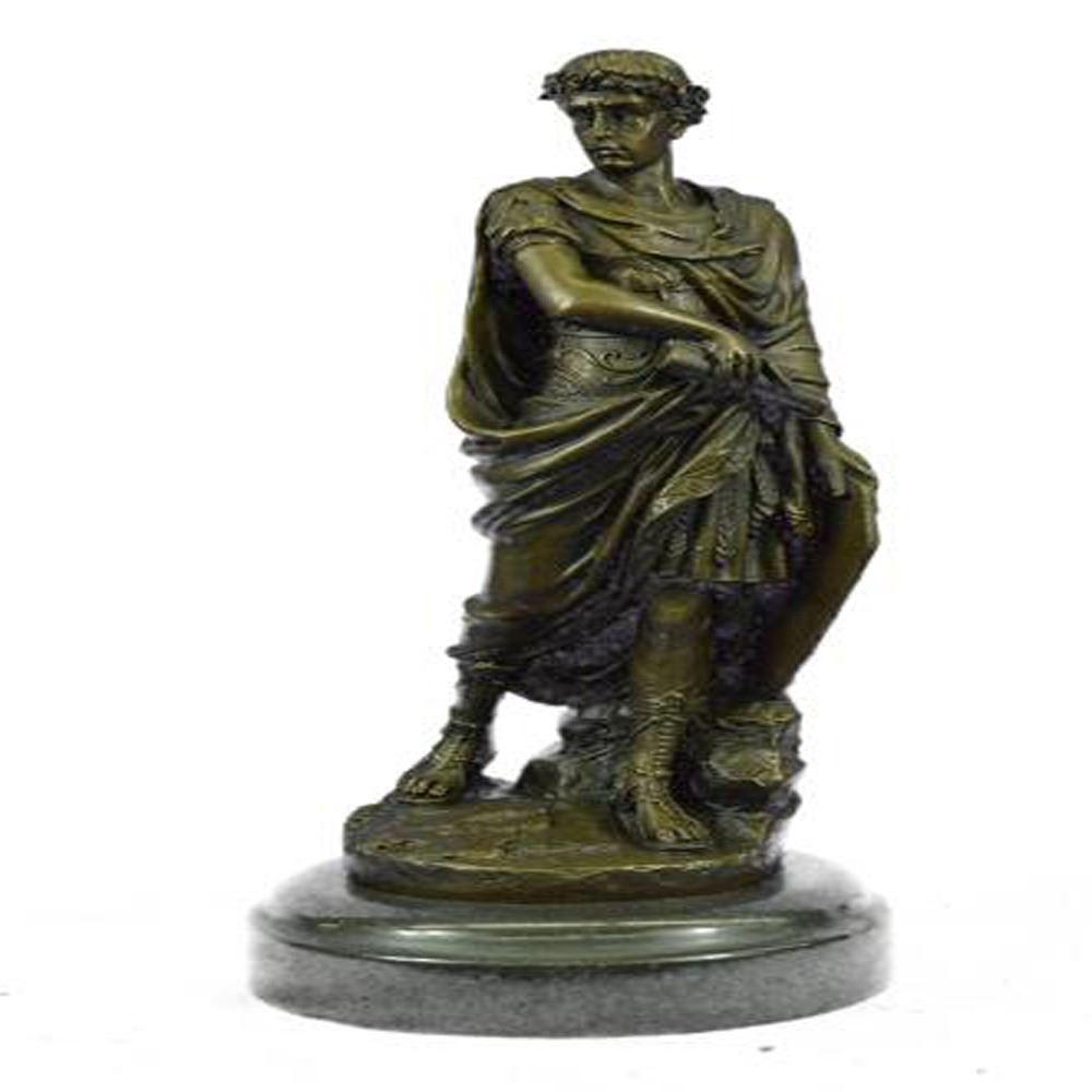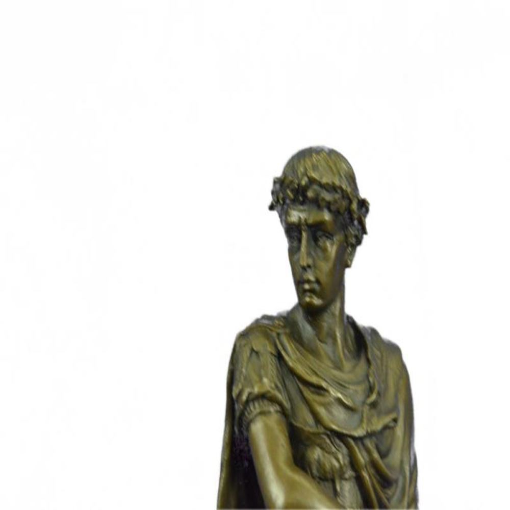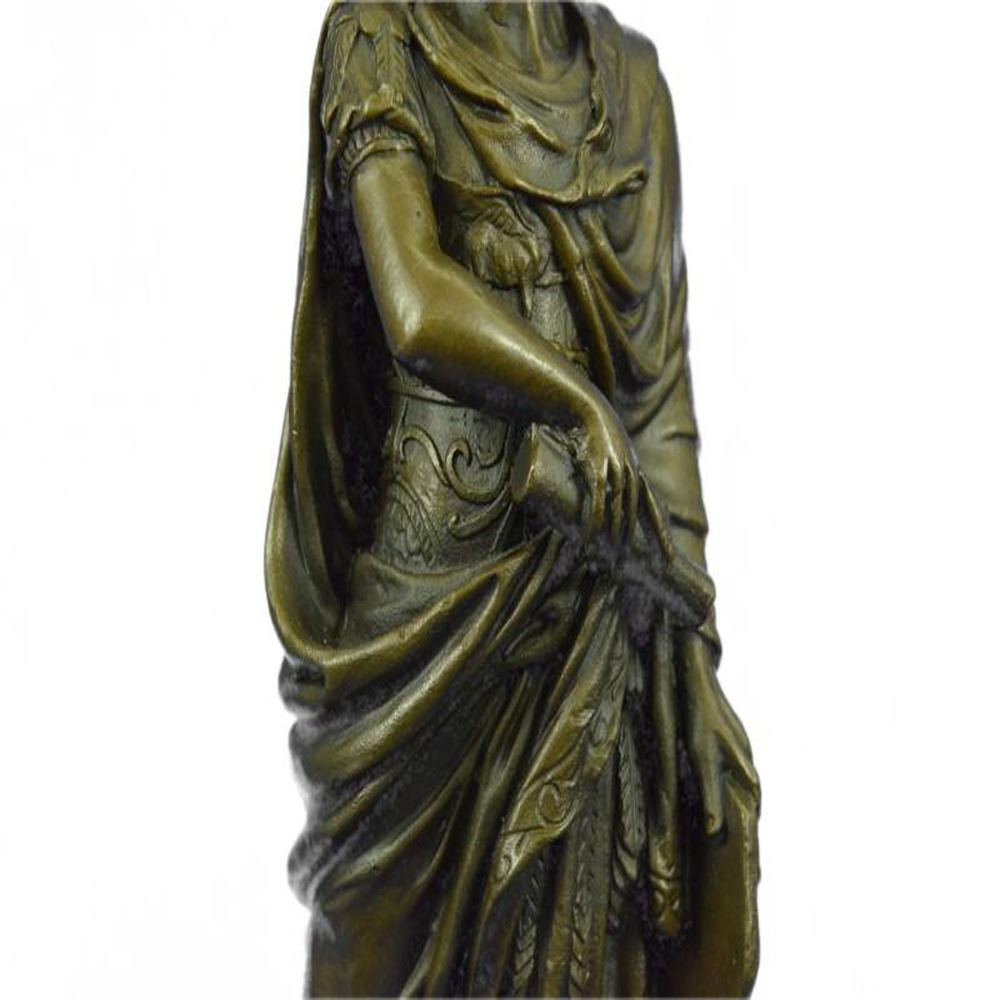 This is a Bronze Sculpture honoring the eminent Gaius Julius Caesar 13 July 100 BC - 15 March 44 BC who was a Roman general and statesman. He played a critical role in the gradual conversion of the Roman Republic into the Roman Empire. He began extensive reforms of Roman society and government. He centralised the bureaucracy of the Republic and was eventually proclaimed dictator in perpetuity. He is seen here in his unrivaled power wearing a generals attire. He wears the chest armor, over what would have been, a wool tunic in a deep purple as used in martial triumphs. He holds a scepter, which is a symbolic ornamental rod or wand borne, in his left hand, significant of a ruling monarch as an item of royal or imperial insignia. His face looks out boldly to the cheering masses, raising his hand in acknowledgment. This icon of the ages was molded using the ageold methods of lost wax casting and stained with a brown patina finish and stands upon a marble base. Bronze Dimensions with Marble Base: Height 10 X Width 5 inches. Weight: 6 LBS.