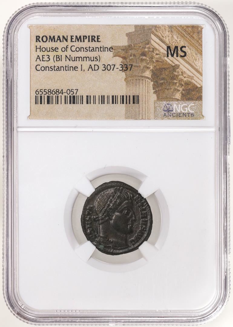 One Roman Empire 307-337 AD Constantine I AE3 Bi Nummus Ancient Coin NGC MS. NGC Certified.